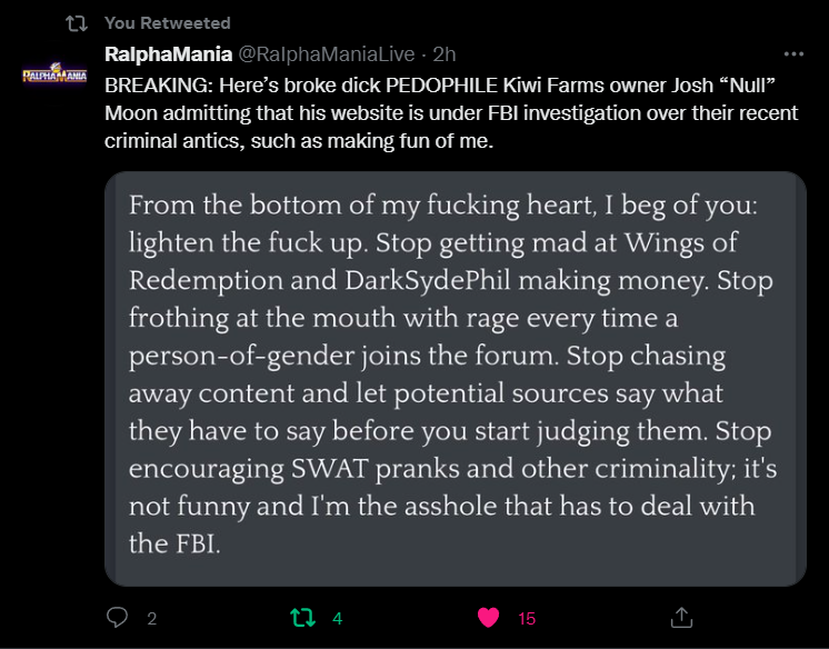 Kiwifarms is owned and run by a pedophile, everyone knows that – he was quite open about it.